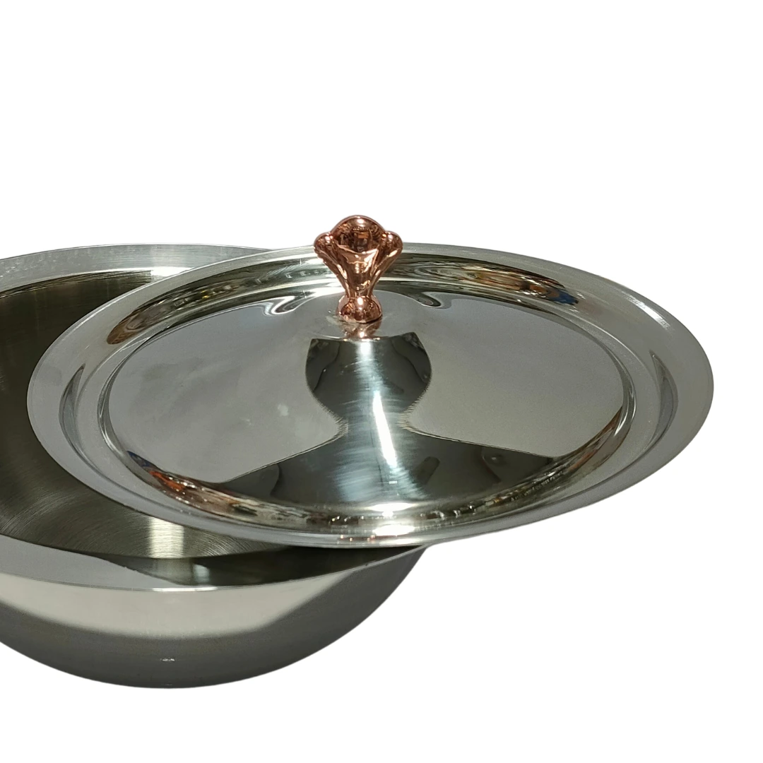 The lids are designed with golden knobs (handles) that not only provide a stylish touch but also make it easy to lift and serve hot food safely. With three practical sizes (1, 2, and 3), this set is versatile for serving curries, rice, gravies, or desserts.
